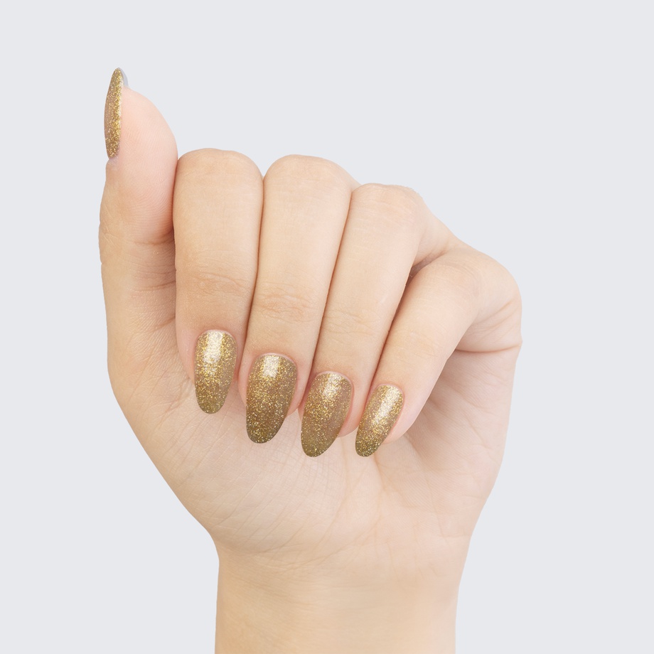 Run the show with this translucent polish full of gold shimmer.